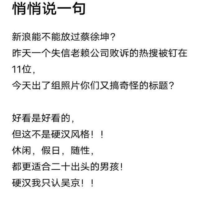 其中也包括少部分粉丝认同这个观点,认为蔡徐坤这个封面造型不属于硬汉风格,只能说是阳光休闲的大男孩,甚至还将锅甩到了微博的头上,责怪他们总整一些稀奇古怪的热搜来贬低丑化蔡徐坤。