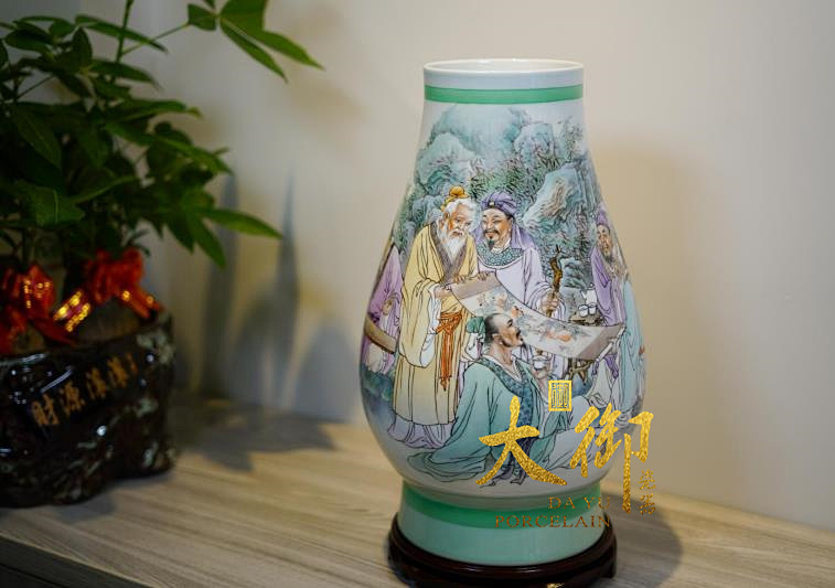 老师笔下的人物绘制意在将人物与环境融合一处,将绘画中的画面意境表现的更加完整,他的合理构图使作品在有限的瓷面上达到一个延伸的无限空间,将人物与所处场景建立天然的联系,各环境之间也相互呼应,浑然天成,形成一个无可挑剔的艺术高度。