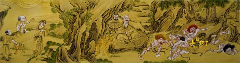 古来画罗汉者众多,有新意者少之又少,而徐鹏飞老师笔下的则大不相同,极具创新意境,用笔大胆细腻,线条诡异飞动,曲折自如,造型变化之趣与传统笔墨之韵相得益彰,所画罗汉,更是状貌古野,绝俗超群,呈现出“笔意纵横写谐趣,豪放狂逸写禅心”的艺术妙境。