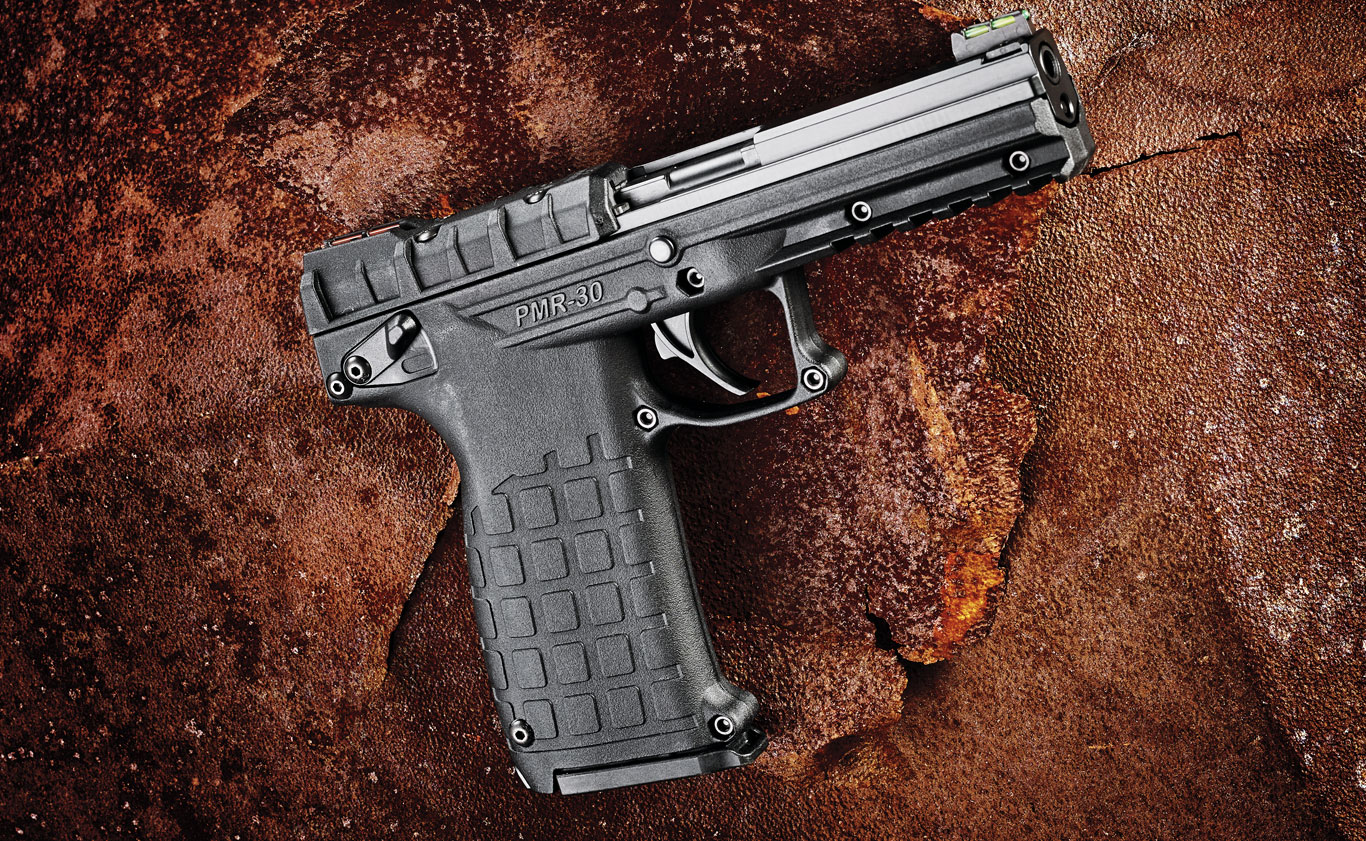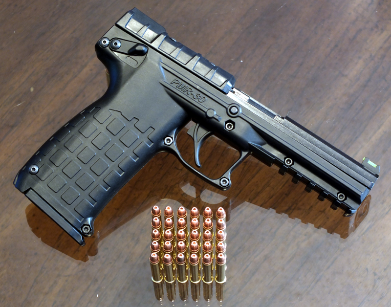 美国凯尔科技(Kel-Tec CNC Industries company)的PMR-30手枪,容弹量30发,使用的是.22WMR。使用的原理是压力延迟开锁半自由枪机,大体上就是,子弹击发的时候,高压气体让弹壳膨胀,使弹壳牢牢地贴紧枪膛,增加阻力,让枪机在这会儿无法抽壳,从而起到一个延迟开锁的作用。此时,枪管和套筒一起进行短距离后座,待子弹飞出枪口,膛压下降,弹壳回缩,枪管停止后座,完成抽壳的动作。