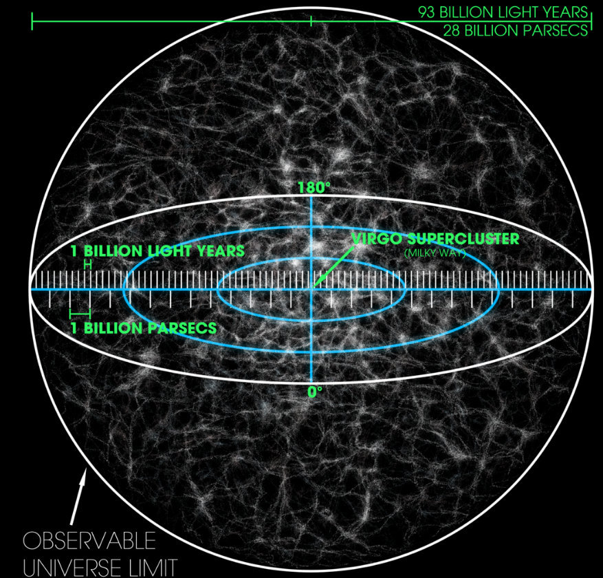 但由于宇宙的膨胀,可观测宇宙的半径并不是固定的138亿光年,人类所观测的古老天体当前的距离比起其原先的位置要遥远得多(以固有距离(proper distance)来衡量,固有距离在现在的时点和同移距离是相等的)。[7] 现在推测可观测宇宙半径约为465亿光年,直径约为930亿光年。[8][9] 根据宇宙学原理,从任何方向到可观测宇宙边缘的距离大致是相等的。