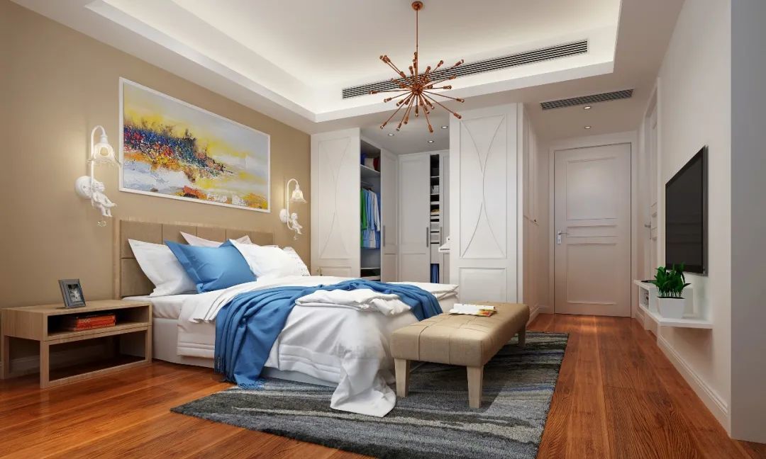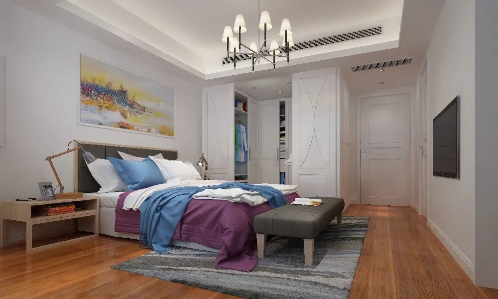 大平层的主人房,由于面积会比较大,在布置主人的时候,可以在床尾增加床尾凳或休闲沙发,同时设置独立衣帽间、工作区等,让主人房成为更高规格的套间设计。