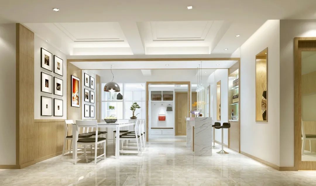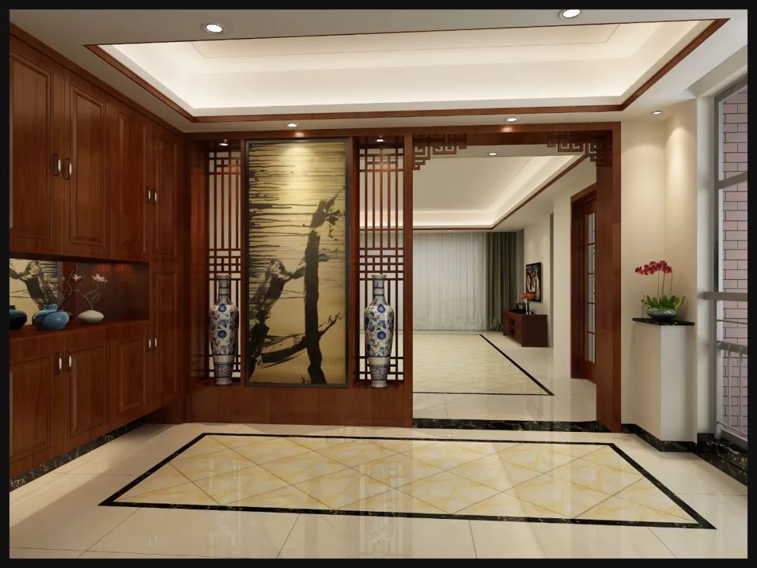 在进门后的玄关区,在布置实用性的换鞋凳与鞋柜后,可能还会有比较大面积的剩余,因此可以在玄关布置一个端景台,摆上装饰品、花瓶等装饰品,让回家后的第一个画面更加优美大方。