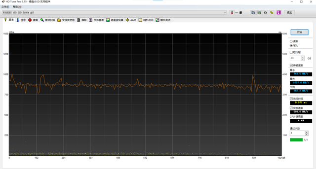 前面有说到 XP1000 采用了无缓存的模式,那么它是否会因为长时间读写而掉速呢?这里IT之家选择使用 HDTune 进行满盘写入测试,可以看出全程基本没有发生明显的长时间的掉速。看来 XP1000 应该是采用了全盘模拟 SLC 的方式,把 TLC 当作 SLC 来用,性能自然上去了。