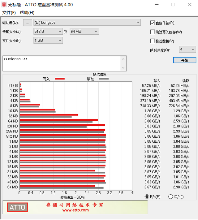 为了直观地了解实际测试中文件的读取速度,我们这里是用了 ATTO Disk Benchmark 对 XP1000 进行不同大小文件速度测试,可以看出在读写大部分大文件时,读写速度都能维持在 3GB/s 左右,速度非常稳定,表现挺不错。