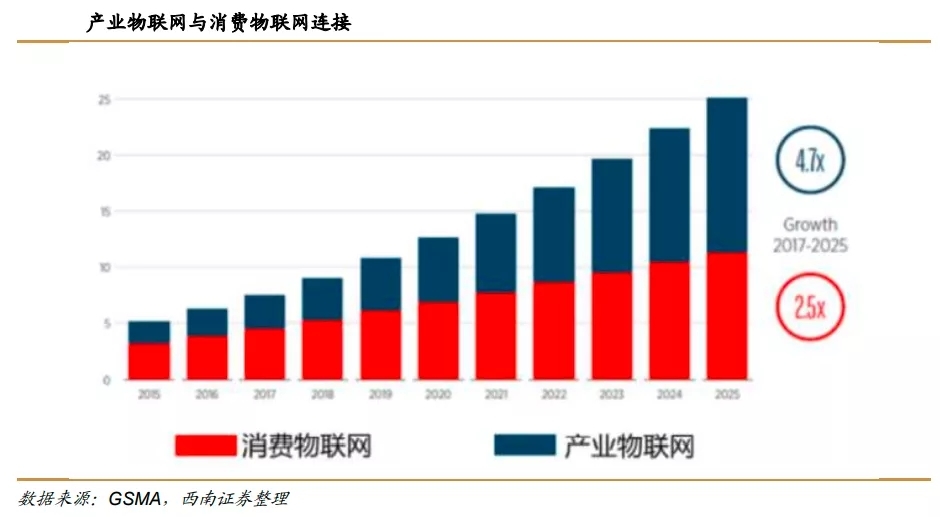 随着物联网向各行各业渗透、行业信息化水平不断提高,产业物联网的连接数量有望超越消费物联网。据世界移动通信界的三大国际组织之一GSMA Intelligence预测,产业物联网连接数在2017年到2025年将实现4.7倍增长,大大高于消费物联网连接数预计实现的2.5倍增长。
