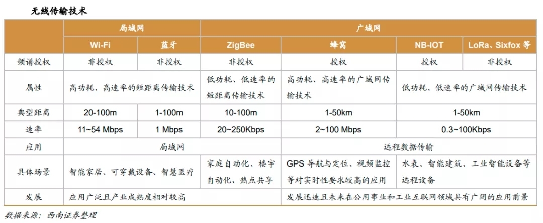 传输层:是物联网的管道,主要负责传输数据。物联网传输以无线为主,按照传输距离的不同又可以分为局域网、广域网两种。其中,局域网主要包括WiFi、蓝牙等短距传输技术,广域网则包含ZigBee、蜂窝、NB-IoT、Lora等技术。5G技术作为其中最新一代移动通信技术,具备高速率、低延时、高可靠性、大带宽等优势,成为传输层的核心技术。