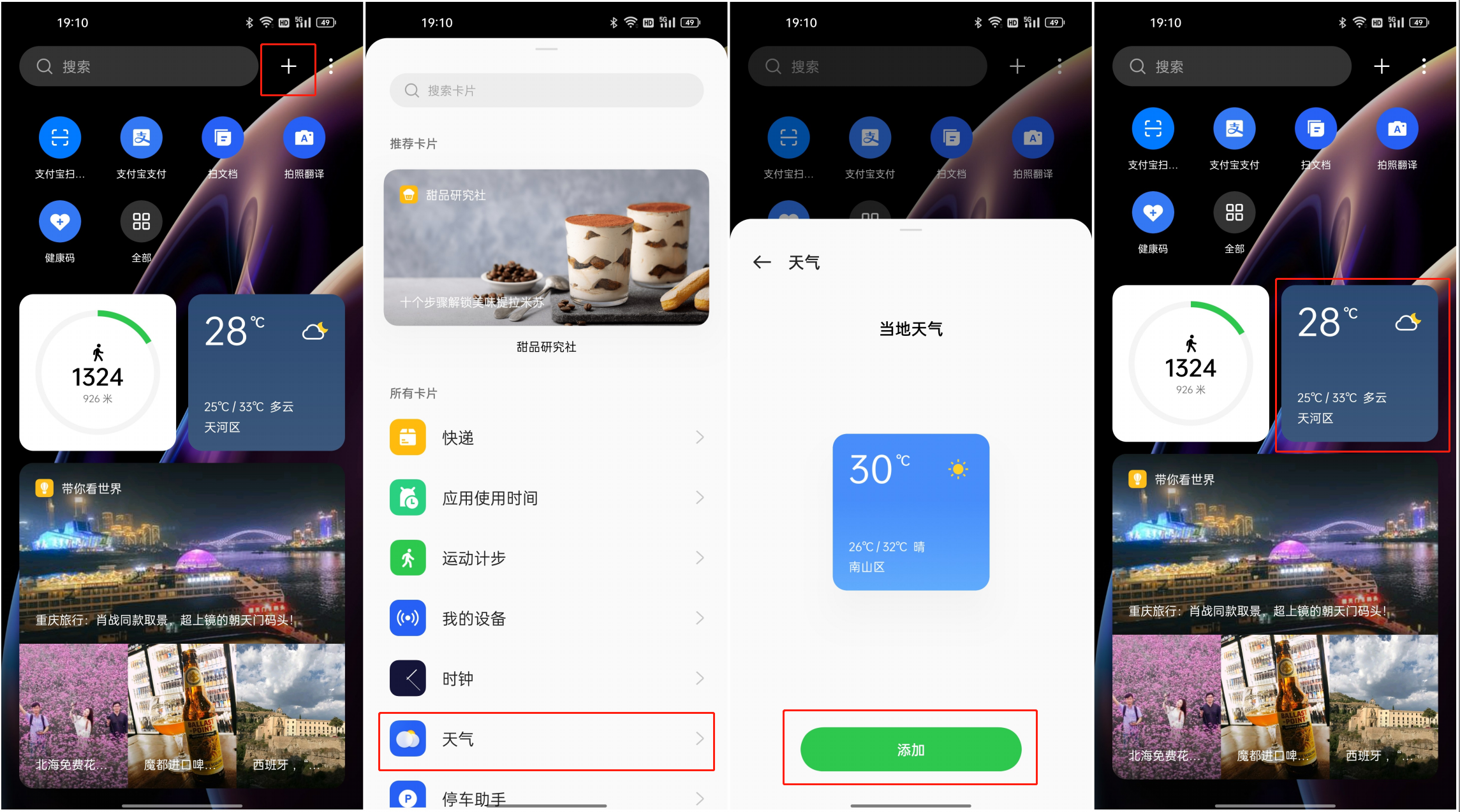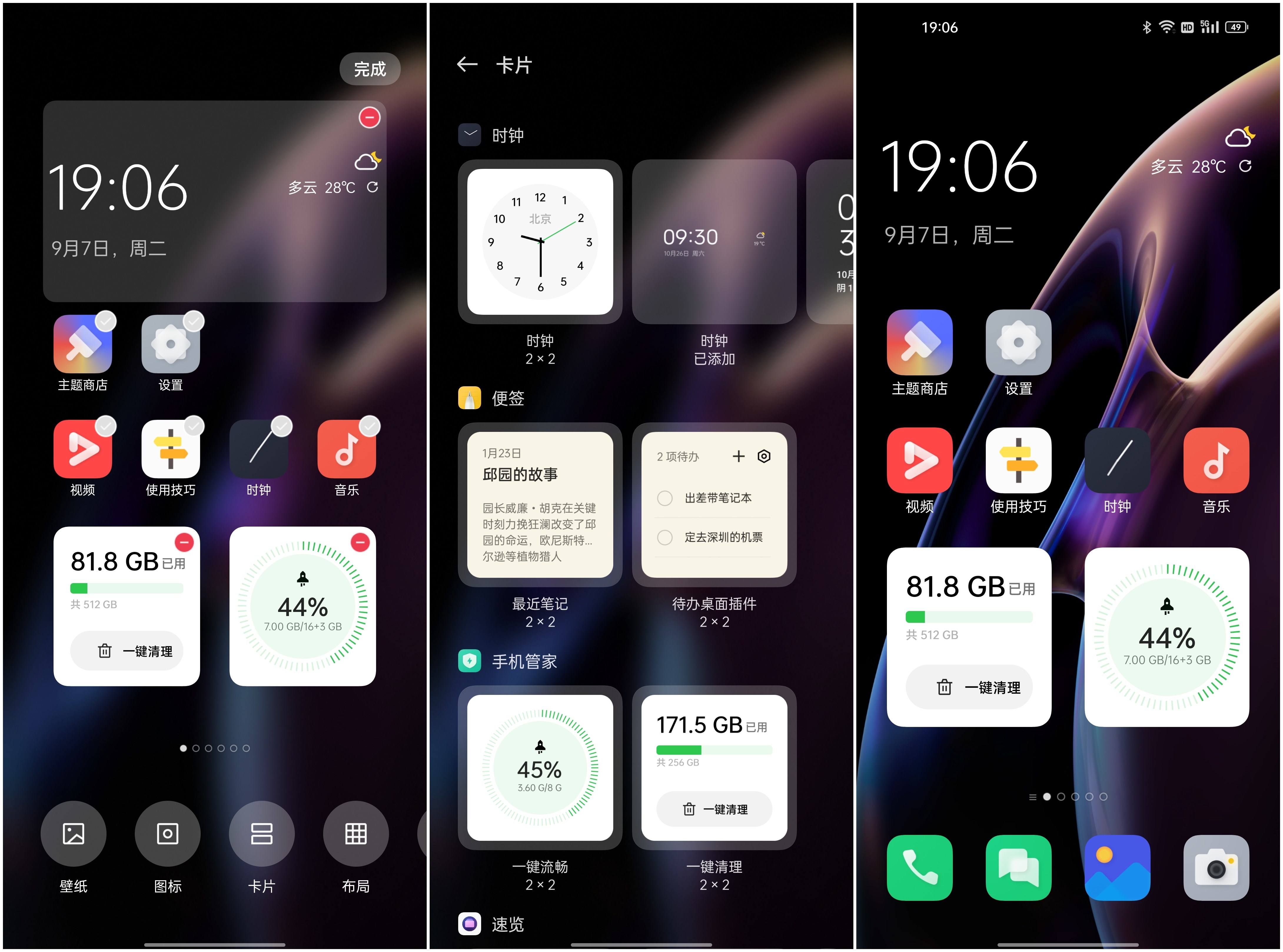 ColorOS 12变动最大的一项:“速览卡片”,相比于上一代,这次也从负一屏覆盖到了主屏幕,且卡片服务涵盖了不同类型,增加了智能找车、快递信息、周边探店等服务卡片,还有像小红书、新浪微博、爱奇艺、知乎、网易云音乐等第三方应用,也以“第三方开发者”的形式加入速览卡片行列。而作为用户的我们,也可以通过自己的用机习惯,搭配不同桌面卡片和应用,例如娱乐桌面、工作桌面、运动桌面等。