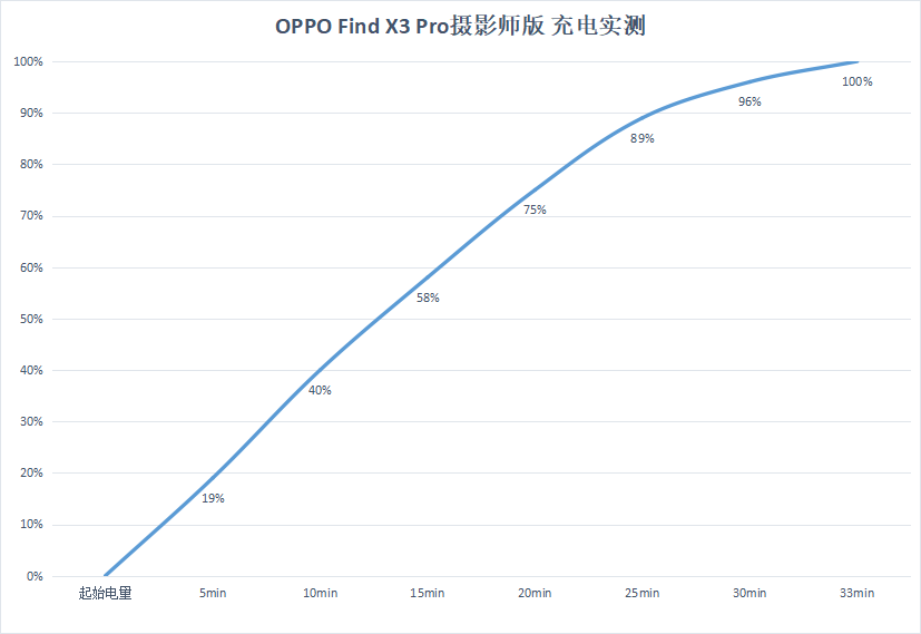 在充电方面,OPPO Find X3 Pro摄影师版延续了“65W有线闪充+30W无线闪充方案”,其中65W闪充我们已经很熟悉了,不过按照惯例我们也对其进行了充电测试,然后10分钟充入了40%的电量,33分钟内电量充到100%。
