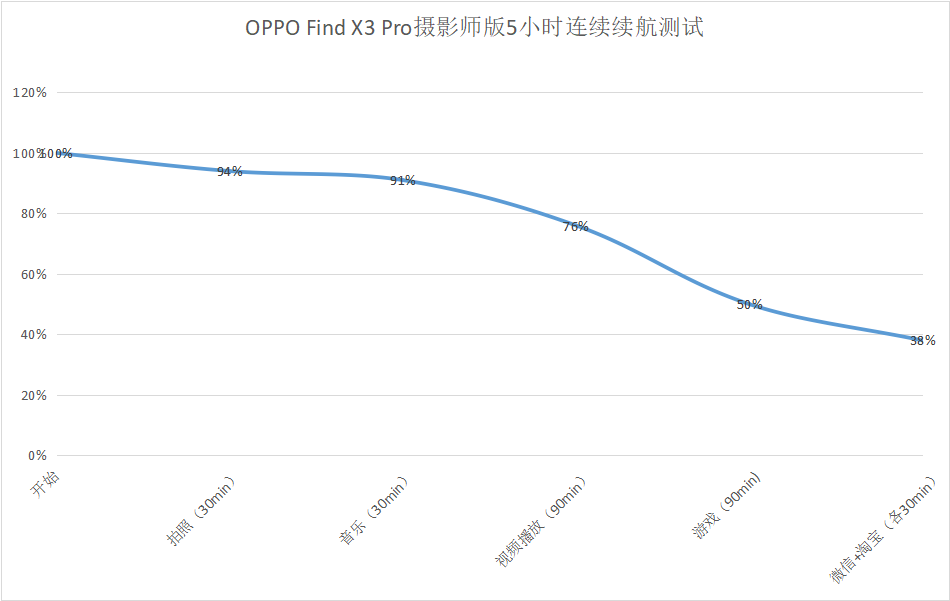 最后一部分留给续航,毕竟续航是支撑所有体验的基础,而OPPO Find X3 Pro摄影版与普通版在硬件上没有太大的区别,同样是一块4500mAh的大电池,只是在最新的ColorOS 12的配合下,对后资源调度方面的优化,后台电量消耗减少 20%,手机续航平均提升 12%。在5个小时的重度续航测试后(测试结果如下图),手机仍有38%的电量,续航表现还是不错,日常使用可以满足一整天的用机需求。