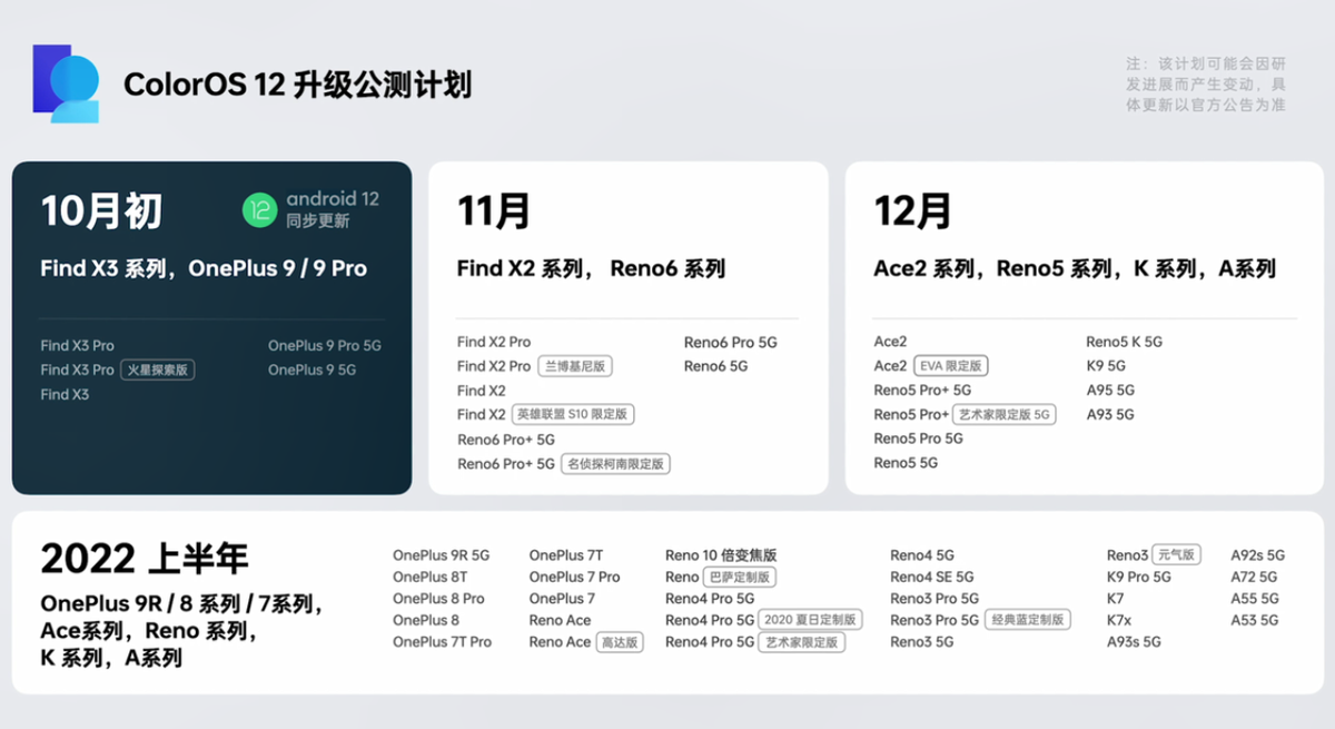 值得一提的是,这次ColorOS 12系统是在OPPO Find X3 Pro摄影师版上首发的,而其他机型的适配也将在不久后进行。据发布会公布的ColorOS 12升级公测计划来看,能够获得升级的机型可以说涵盖了不同价位段以及一些十分「老旧的机型」,这一波OPPO是真的良心。具体的升级设备以及升级时间,大家可以看看下面这张图片。