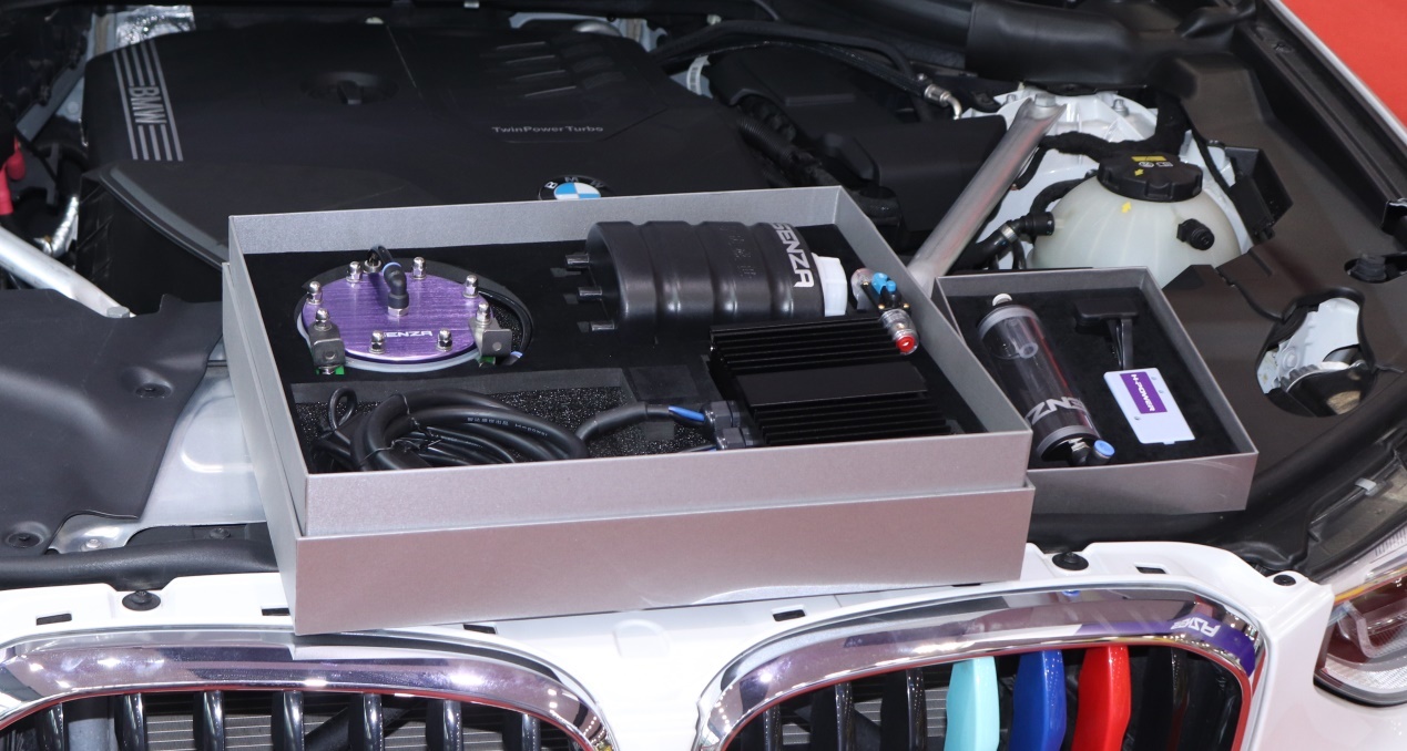 该产品针对传统燃油汽车因为汽油燃烧不充分导致的起步无力、换挡顿挫、排放超标、积碳增多等问题,引入“PEM质子交换膜电解纯净水”的先进技术,将微量氢气引入到发动机,帮助发动机内燃油充分燃烧。