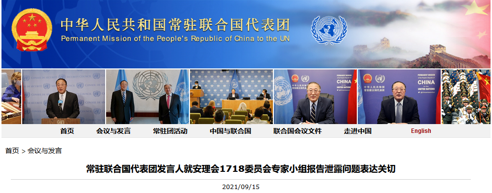 据中国常驻联合国代表团官网消息,当地时间9月15日晚,中国常驻联合国代表团发言人就安理会“1718委员会”(对朝鲜制裁委员会)专家小组报告泄露问题表达关切。