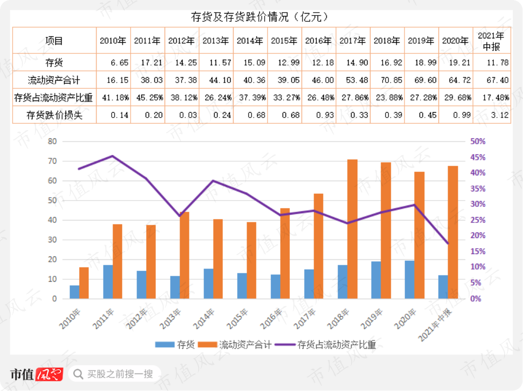 十几亿的存货就意味着要计提相应的跌价损失,必然冲击当期利润。2016年以来存货账面价值从12.18亿元增加至2020年的19.21亿元,每期均计提大几千万的存货跌价损失。