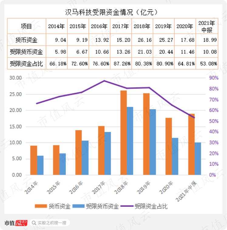 汉马科技的货币资金看起来不少,2013年以来基本账上都有十几亿,甚至二十几亿元,但仔细翻看其年度报告会发现这些货币资金中绝大部分都是受限资产。