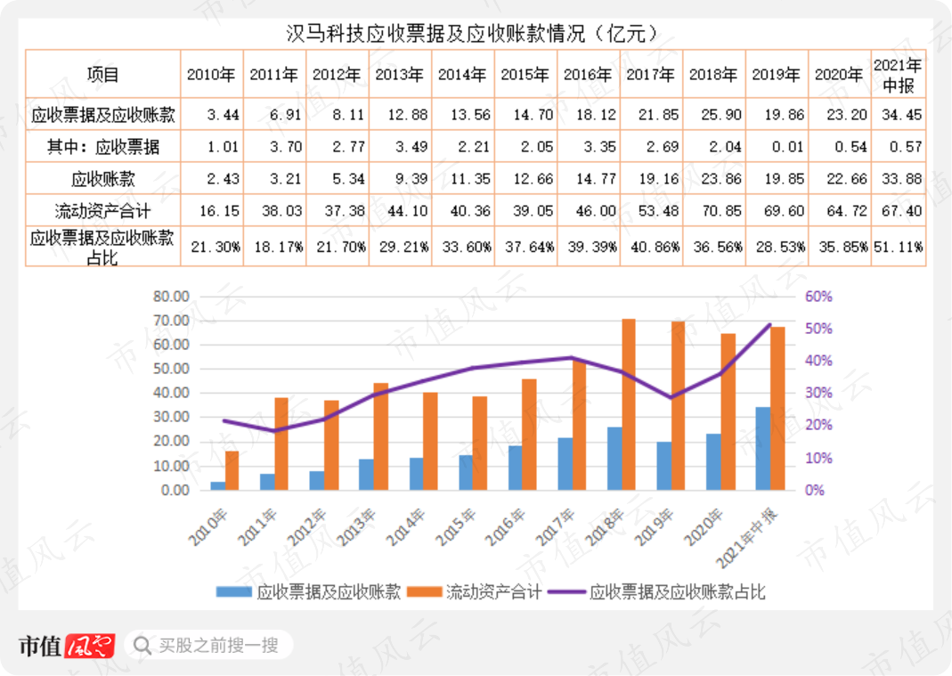 汉马科技的应收票据及应收账款从2010年的3.44亿元增长到2021年中报的34.45亿元,增长了正好10倍。