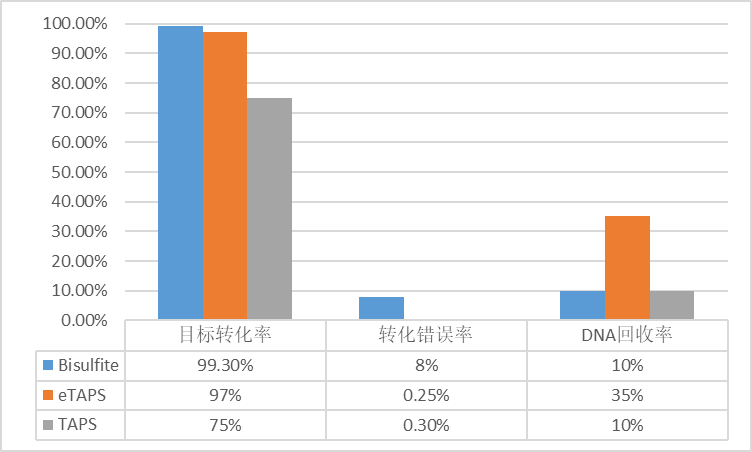 图4. Bisulfite、TAPS、翌圣eTAPS转化率,转化错误率以及DNA回收率对比。