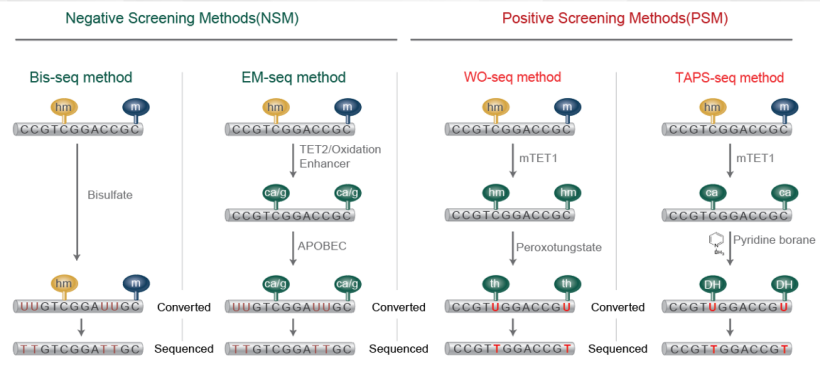 DNA甲基化检测首先要进行甲基转化,目前有两种方案,一种是通过将非甲基化的C转化为U,另一种是将甲基化的C转化为U。前者以重亚硫酸盐测序(BS-Seq)为代表:利用重亚硫酸盐(Bisulfite)将DNA上未发生甲基化的C转变成U(甲基化C则不受影响),由此鉴定甲基化位点,转化效率高达99%,但BS-Seq缺点也十分突出: