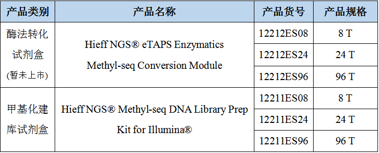 基于翌圣生物开发的eTAPS酶法转化技术,可以更高效对各类型样本中甲基化位点进行转换,结合翌圣生物研发的各类DNA建库试剂盒,可助力DNA甲基化在科研、临床、特别是早筛市场上应用。