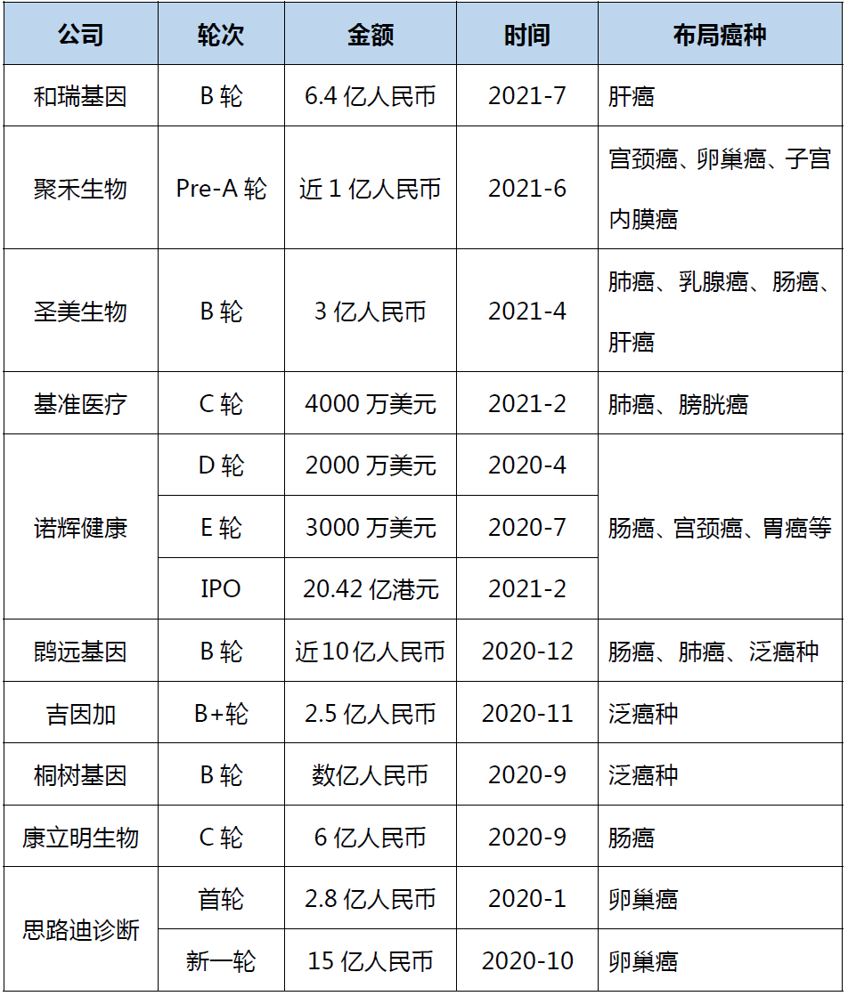 表1. 近一年癌症早筛企业融资统计。(信息来源于网络)
