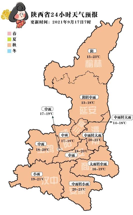 今天白天:全省阴天,陕北部分地方有阵雨或小雨(0-1mm)、延安南部、关中、陕南有小到中雨(5-15mm),关中西部部分、陕南东部部分地方有大雨(15-30mm)。