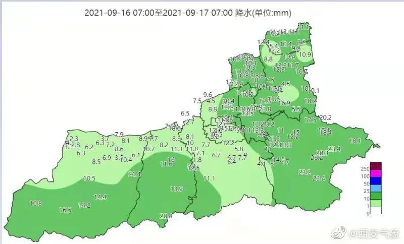 西安市气象台今天早上7点发布雨情通报: 09月16日07时至17日07时,西安市普降小到中雨,最大降水量出现在蓝田王顺山景区26.2毫米,全市具体降水量如下(单位:毫米):周至本站6.3,九峰镇耿峪村21.4;鄠邑本站8.2,朱雀森林公园20.4;长安本站6.7,细柳12.5;蓝田本站12.2,王顺山景区26.2毫米;临潼本站7.5,小金18.2;高陵本站8.9,姬家11.0;西安市气象局大院12.2,泾河12.2;阎良新兴街办13.6;灞桥区政府22.9,老湾吴村16.8;西咸新区沣河金湾公园7.5。