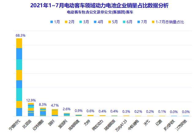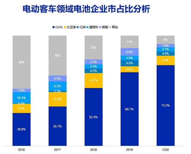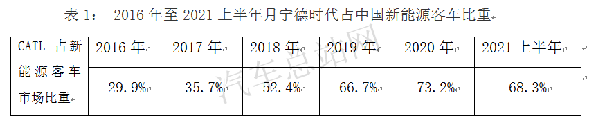 公开数据显示,2016年配套宁德时代电池的新能源客车产品占据新能源客车市场整体29.9%的比重,2017年为35.7%,2018年52.4%,2019年为66.7%,2020年为73.2%,到2021年前7月占比为68.3%。