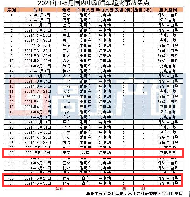 据高工产业研究院(GGII)最新统计数据,2021年1-5月国内共发生电动汽车起火事故34起,较去年同期增加20起;涉及车辆数目38辆,较去年同期增长73%。