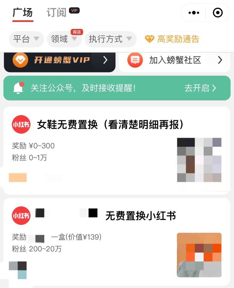记者发现,在“螃蟹通告”等小程序上,可以看到各种各样的软广任务,报酬和对账号的要求不尽相同。通常来说,0粉丝的素人发一条软文可以得到3-5元,1000粉以上的则可以得到几十元不等。越是要求低的任务,报名参与的人数越多。