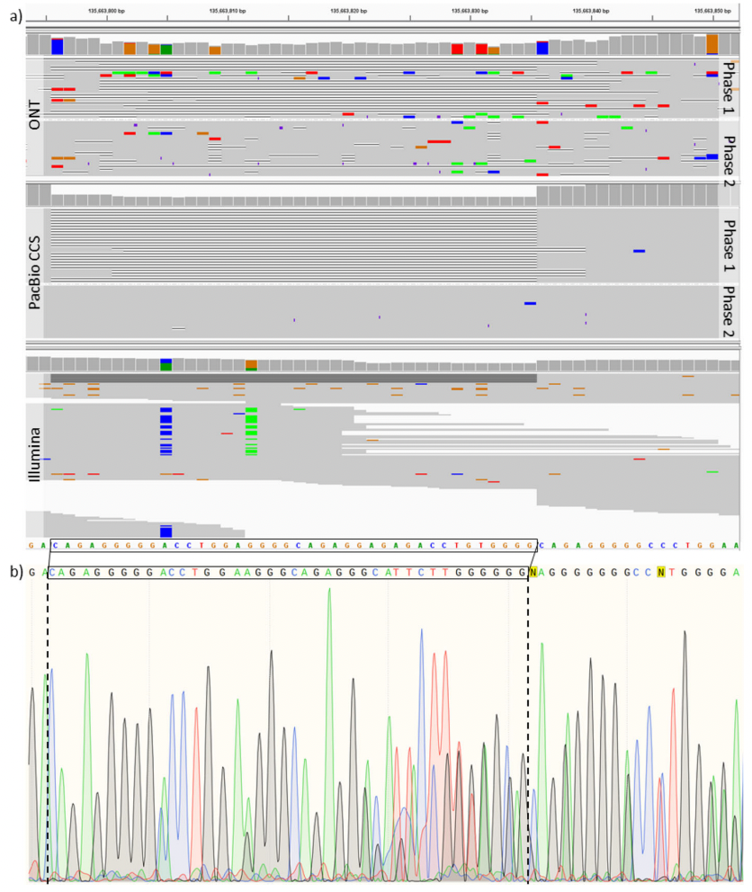 对于NanoCalle在InDel检测方面的性能,研究发现NanoCalle可以检测到无法被短读长测序检测到的变异。结果显示,NanoCaller在chr9:135663805处检测到缺失,其他算法在chr9:135663799处检测到缺失。如图6a所示,与几乎没有证据支持缺失变异的短读长测序数据相比,NanoCaller可提供缺失变异的准确信息。