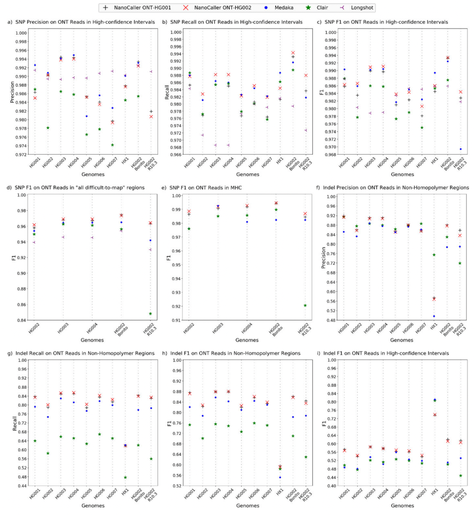为评估NanoCaller的性能,研究团队将NanoCaller在牛津纳米孔测序数据中的变异检测性能与Medaka、Clair 和 Longshot这三种现有算法进行了比较。跨基因组分析对于证明变异检测算法的性能至关重要,将基于变异检测算法的机器学习模型在一组基因组上进行训练,并在其他基因组进行测试。结果显示,NanoCaller获得的F1-score高于其他三个算法,表明NanoCaller的性能优于其他算法。 (图2a,b; F1-score经常被用来判断算法的精确度,能同时考虑精确率和检测率)