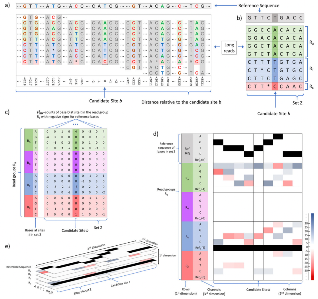 NanoCaller是将长读长测序数据与参考基因组的比对作为输入,根据指定的最小覆盖率阈值和替代等位基因频率阈值或插入/删除频率阈值选择候选SNP或InDel位点(图1)。