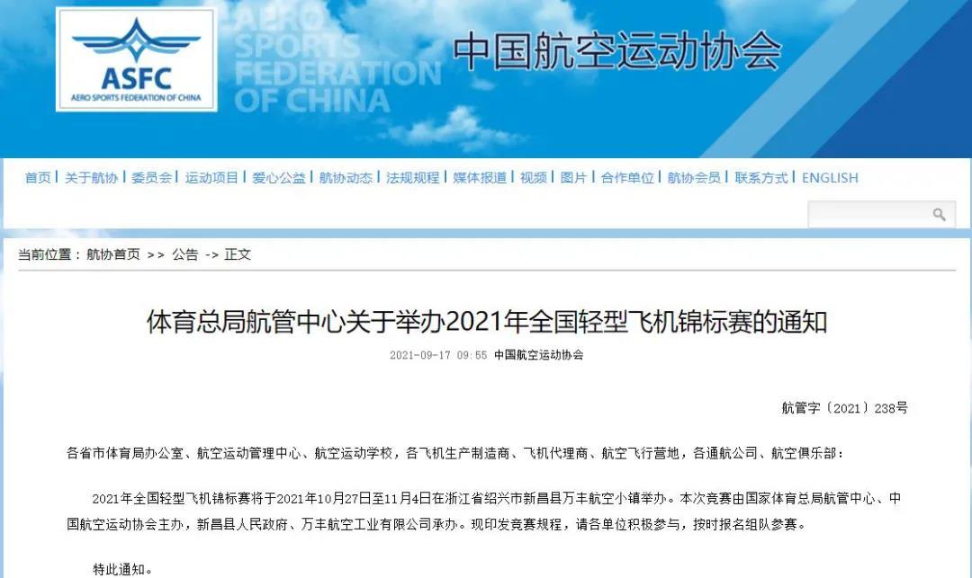 9月17日,国家体育总局航空无线电模型运动管理中心发布通知,该通知指出,2021年全国轻型飞机锦标赛将于10月27日至11月4日在万丰航空小镇举办。本次赛事由国家体育总局航管中心、中国航空运动协会主办,新昌县人民政府、万丰航空工业有限公司承办。