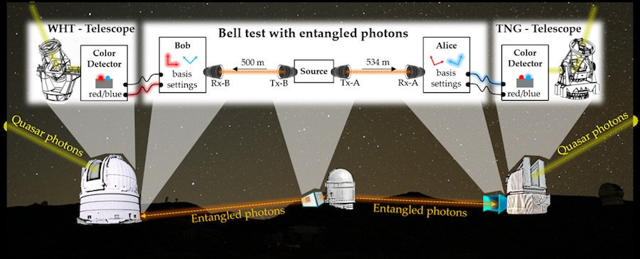 约120亿年前,加速的光离子离开了一个名为类星体的极其明亮的天体,开始了一段通往还不存在的行星的漫长旅程。超过40亿年以后,更多的光子离开了另一颗类星体去进行类似的长途跋涉。当地球和它所在的太阳系形成,生命进化,人类开始学习物理,这些粒子继续它们的道理。最终,它们在拉帕尔马加那利群岛通过一对望远镜着陆,这对望远镜是为了测试现实的本质而设立的。