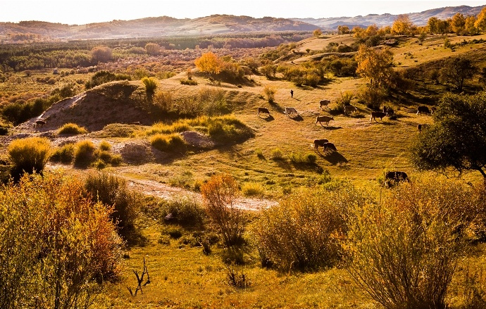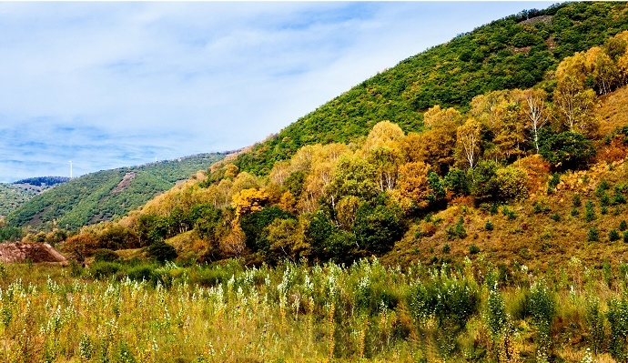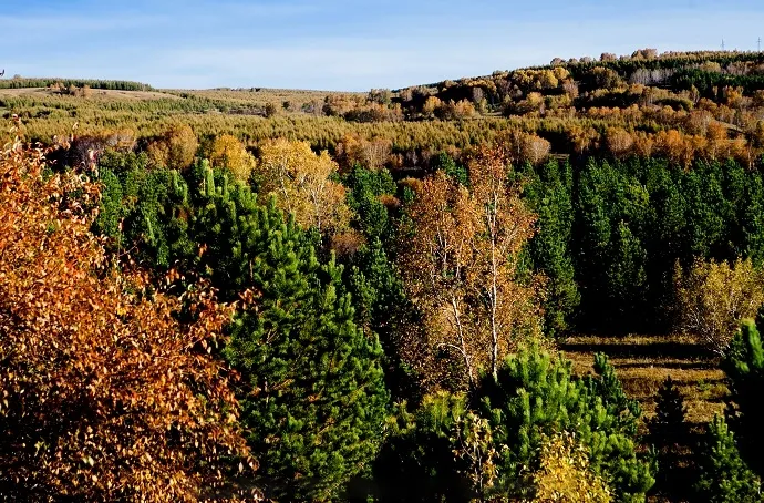 进入秋日里的御道口草原森林风景区,错落的林草时而变幻着色彩,金黄与棕色辉映、深绿与火红相间,色彩斑斓,被誉为“中国最美的秋天”。