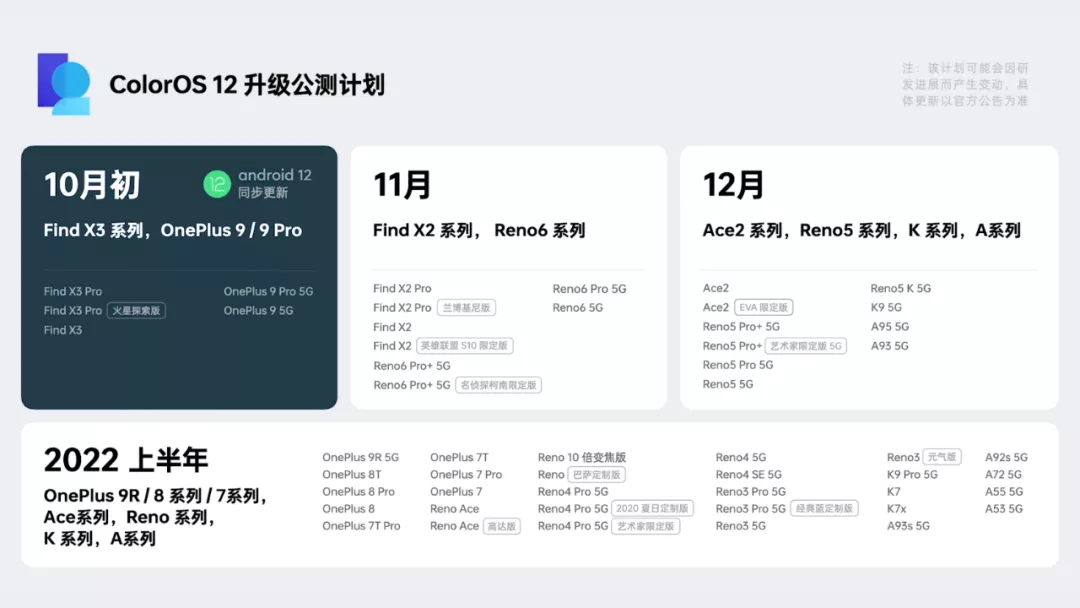 发布会上给出了 ColorOS 12 升级公测计划,戳下面图片,放大看看你的机型在什么时候能升级?