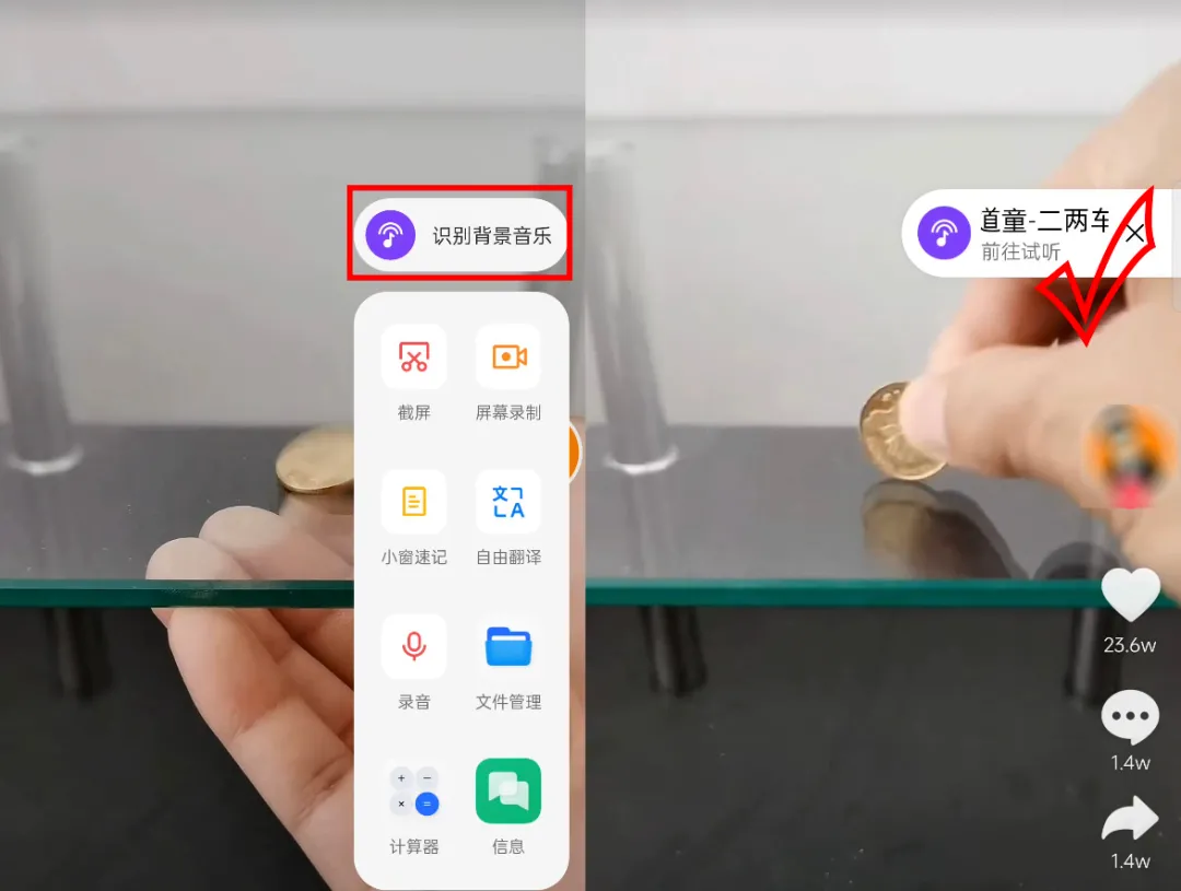 第二个小功能适合爱刷小视频的盆友,很多时候在刷视频过程中,遇到很魔性的背景音乐,却不知道歌名。