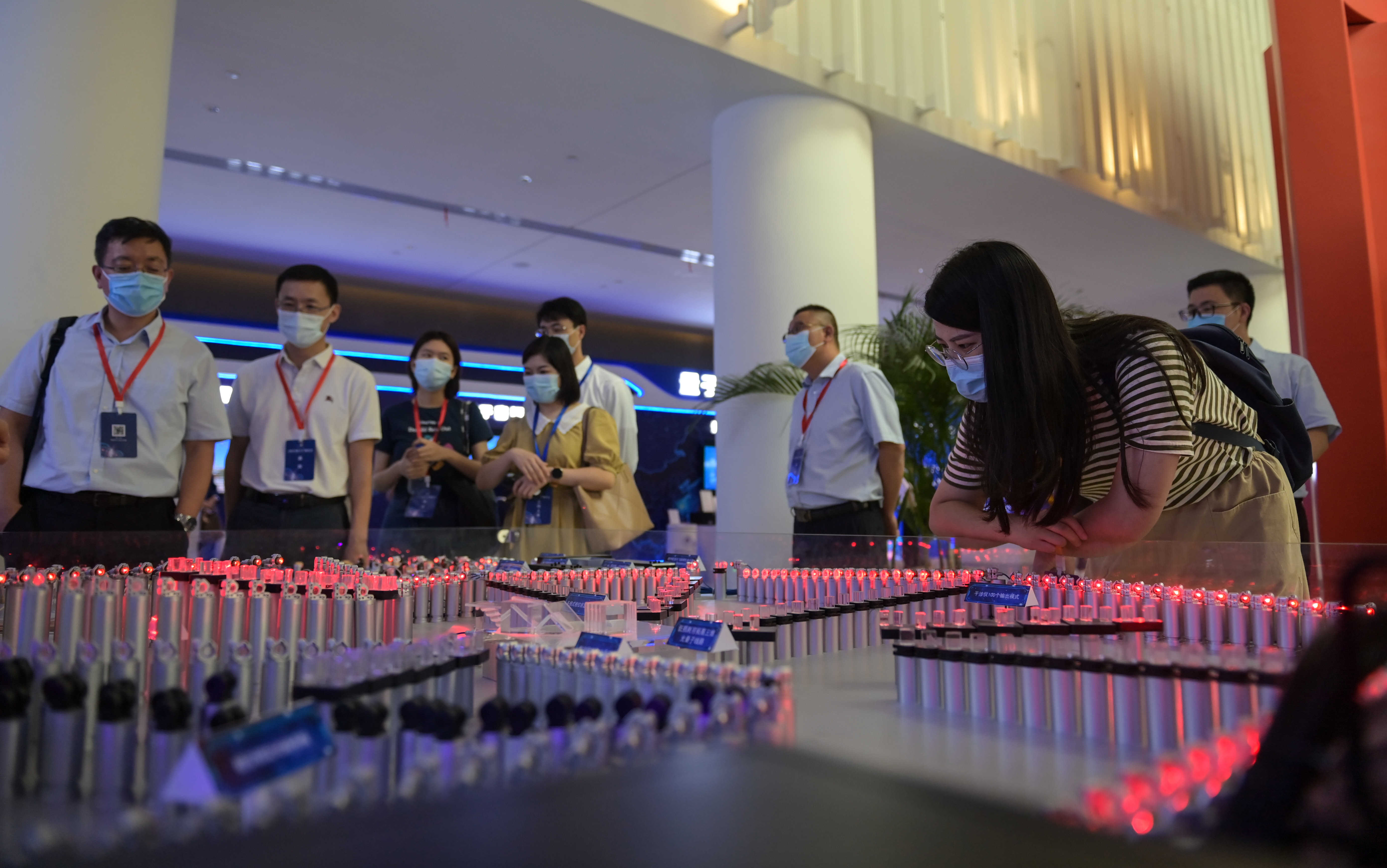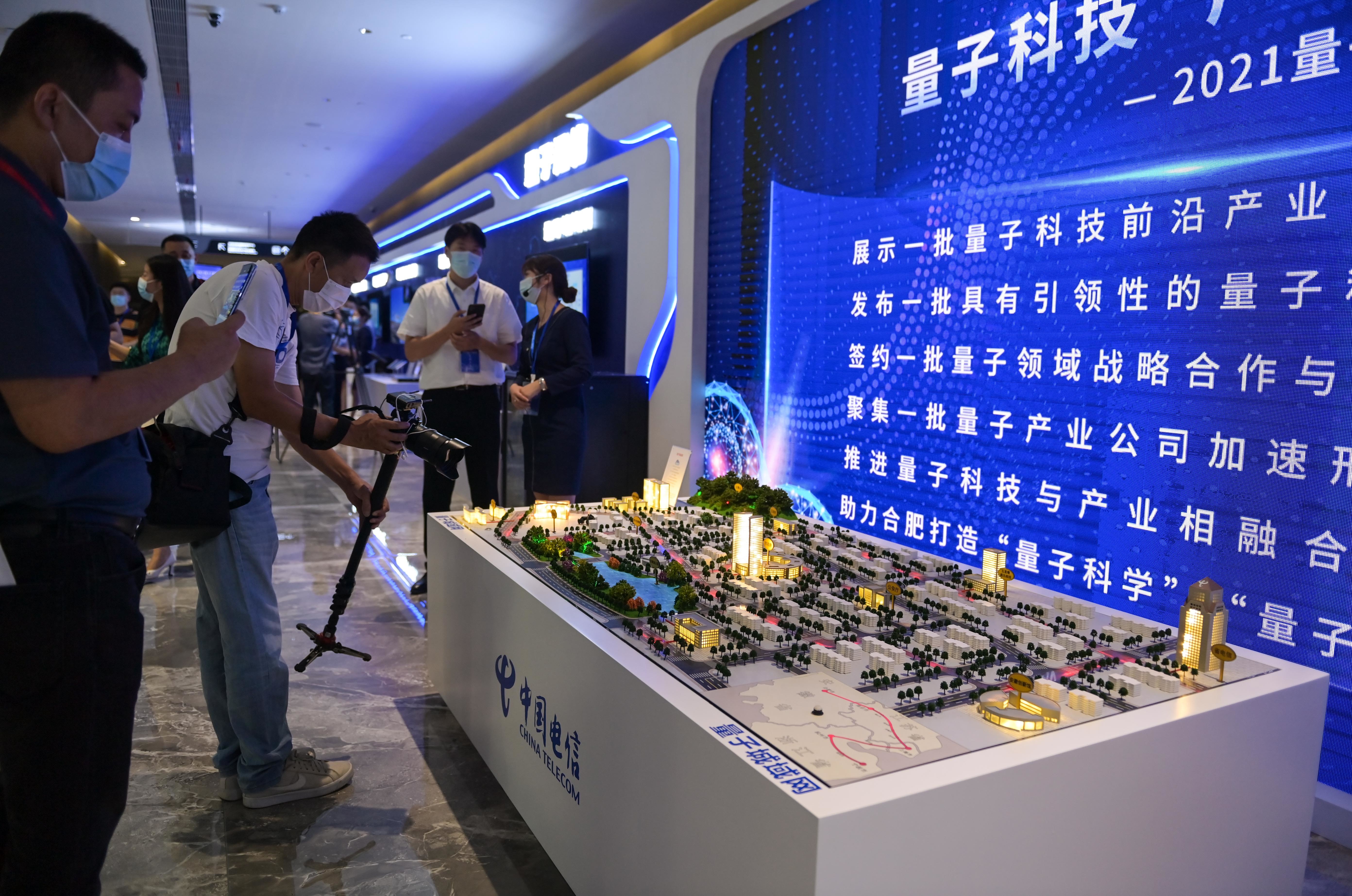 9月18日,参会人员在2021量子产业大会上参观量子城域网微缩模型。新华社记者 杜宇 摄