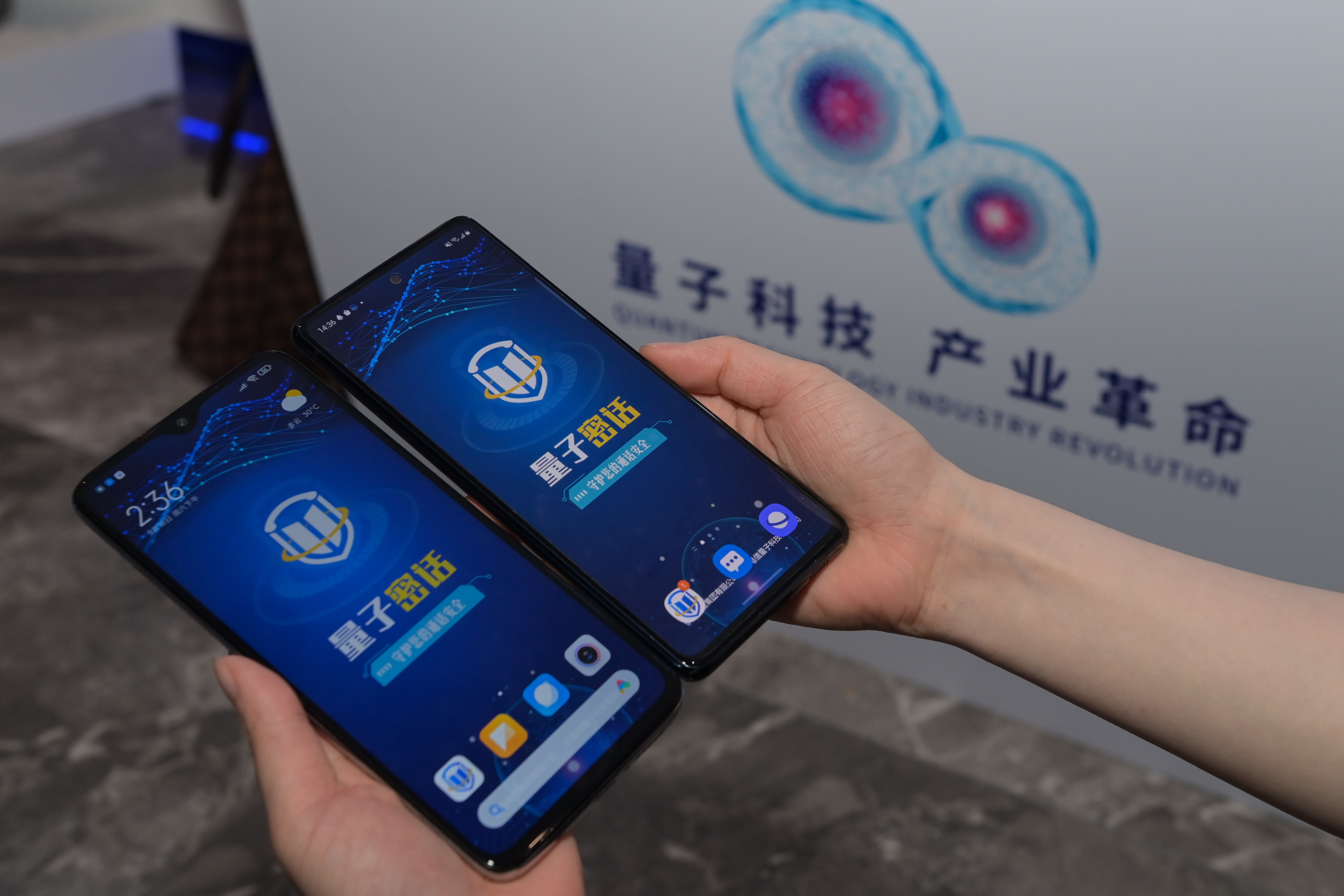 9月18日,参会人员在2021量子产业大会上体验具有量子密话功能的手机。新华社记者 杜宇 摄