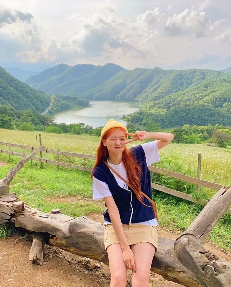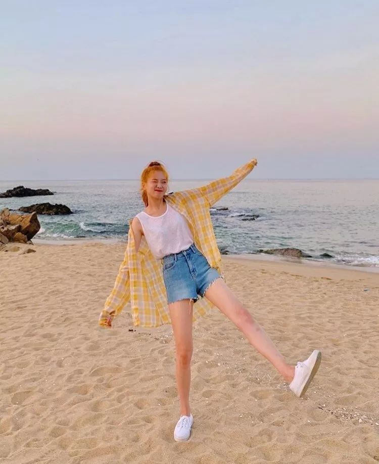 白色背心+牛仔撕边短裤素雅干净,外搭一件黄色格纹衬衫,整个人都变得明艳起来,十分亮眼。