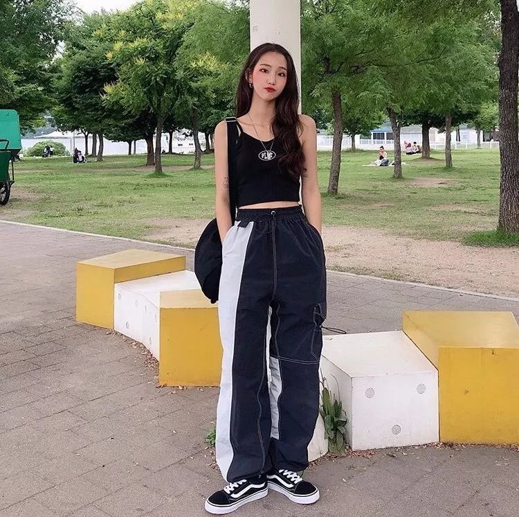 黑色吊带更加显白,下身选择一条宽松的工装裤,洒脱又不羁。