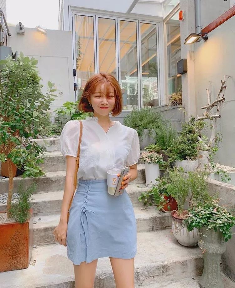 荷叶边+V领,充满设计感搭湖水蓝抽绳半身短裙,淑女又浪漫。