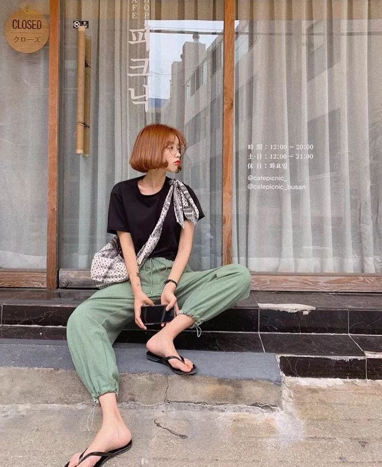 黑色沉稳大气搭牛油果绿束脚裤,散发的是简洁的率性和经典的耐看。
