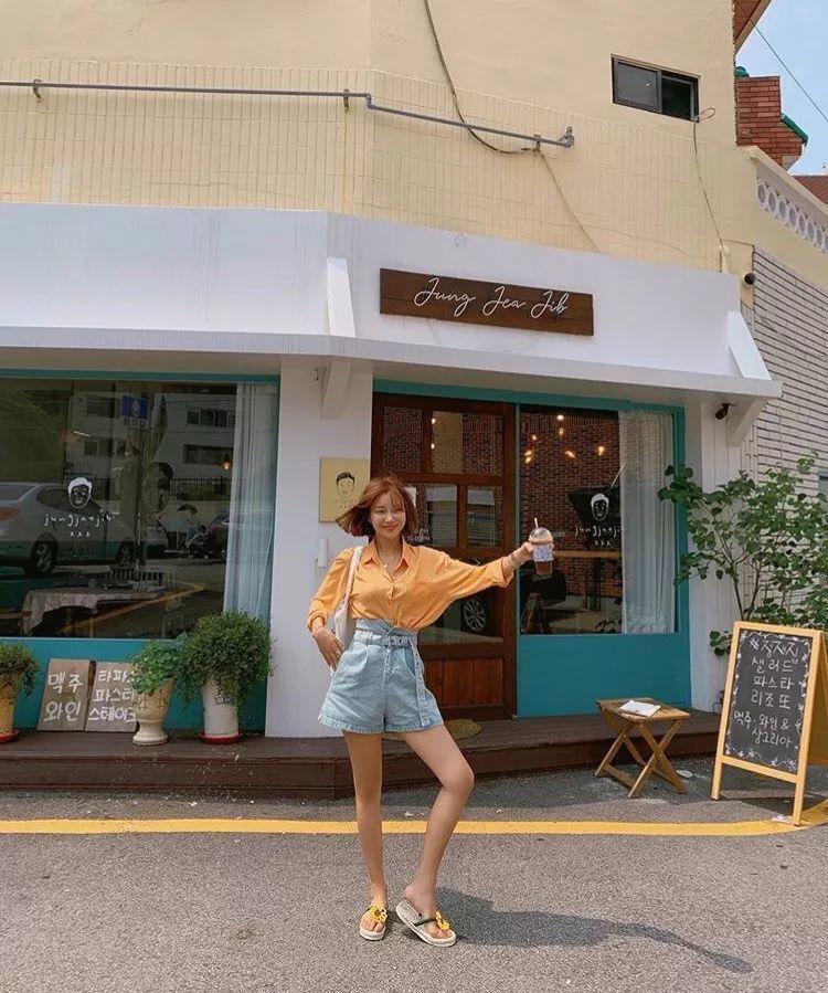 姜黄色衬衫+高腰收腰短裤,OL风满满,温柔的气息扑面而来。