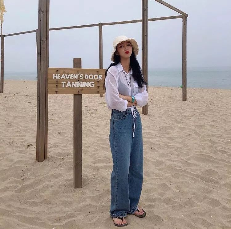 微透白衬衫内搭一件黑色吊带,下搭牛仔阔腿裤,性感而不庸俗。