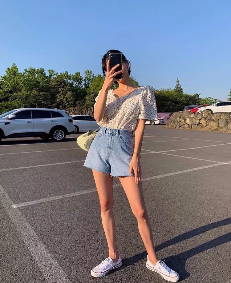 碎花给人一种清新脱俗的气质感+简单随意的牛仔短裤,尽显优雅与温婉。