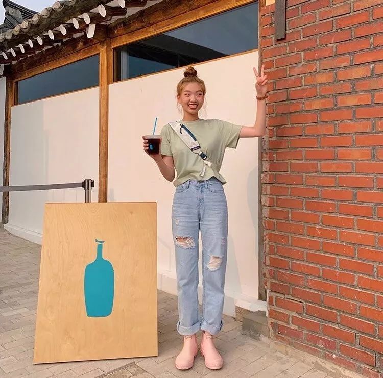 莫兰迪绿给人视觉上的舒心感,又充满活力感,搭配卷边牛仔裤,俏皮可爱。