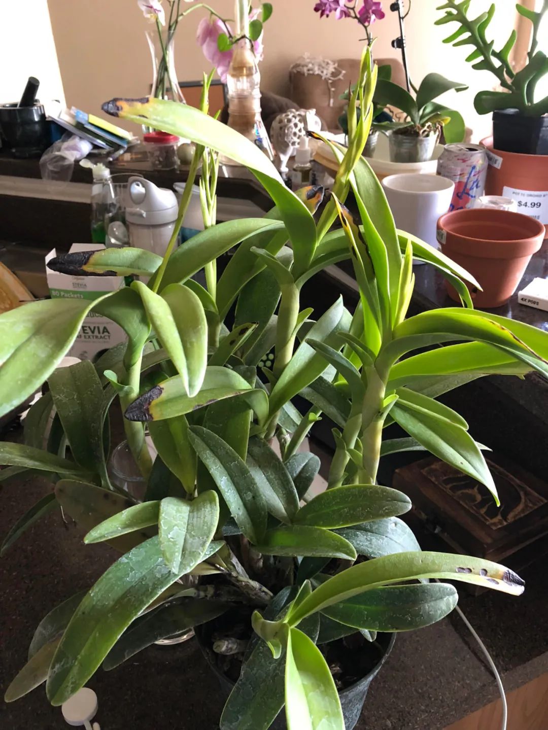 有一点要提醒大家,卡特兰在开完花之后,会进入休眠的状态,这个时候要稍微减少浇水,停止施肥,并要避免空气过度潮湿,让它更好的休眠,休眠期一般就是6~8周左右。