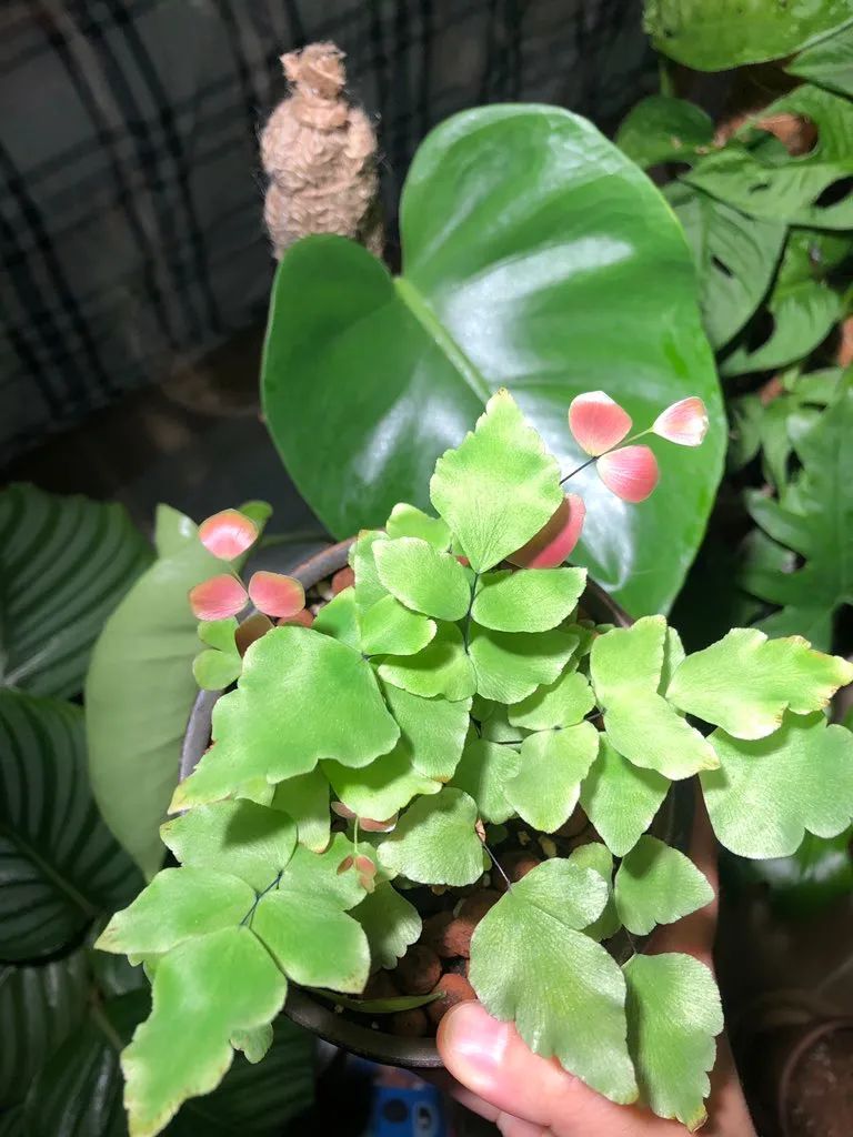 大叶铁线蕨是进口的铁线蕨品种,现在它的受众还是比较小,园艺价值有待开发,它最大的特点就是嫩叶呈粉红色的,叶子由粉红色慢慢会变成碧绿色。