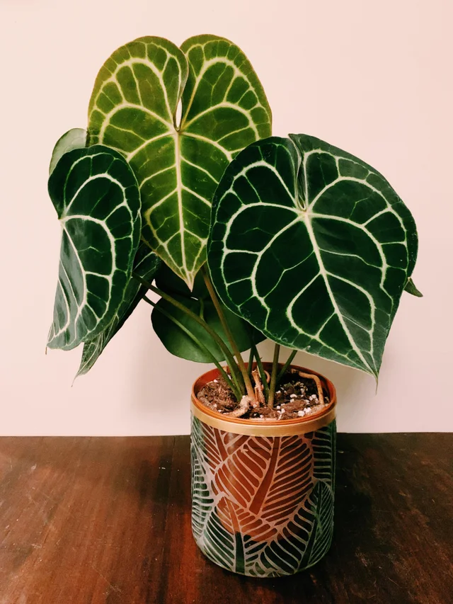 水晶花烛有着心形的翠绿叶子,叶面上有着特别明显的银白色叶脉,它的叶子质感就像天鹅绒一般,是天南星科花烛属特别好看的一种观叶植物。